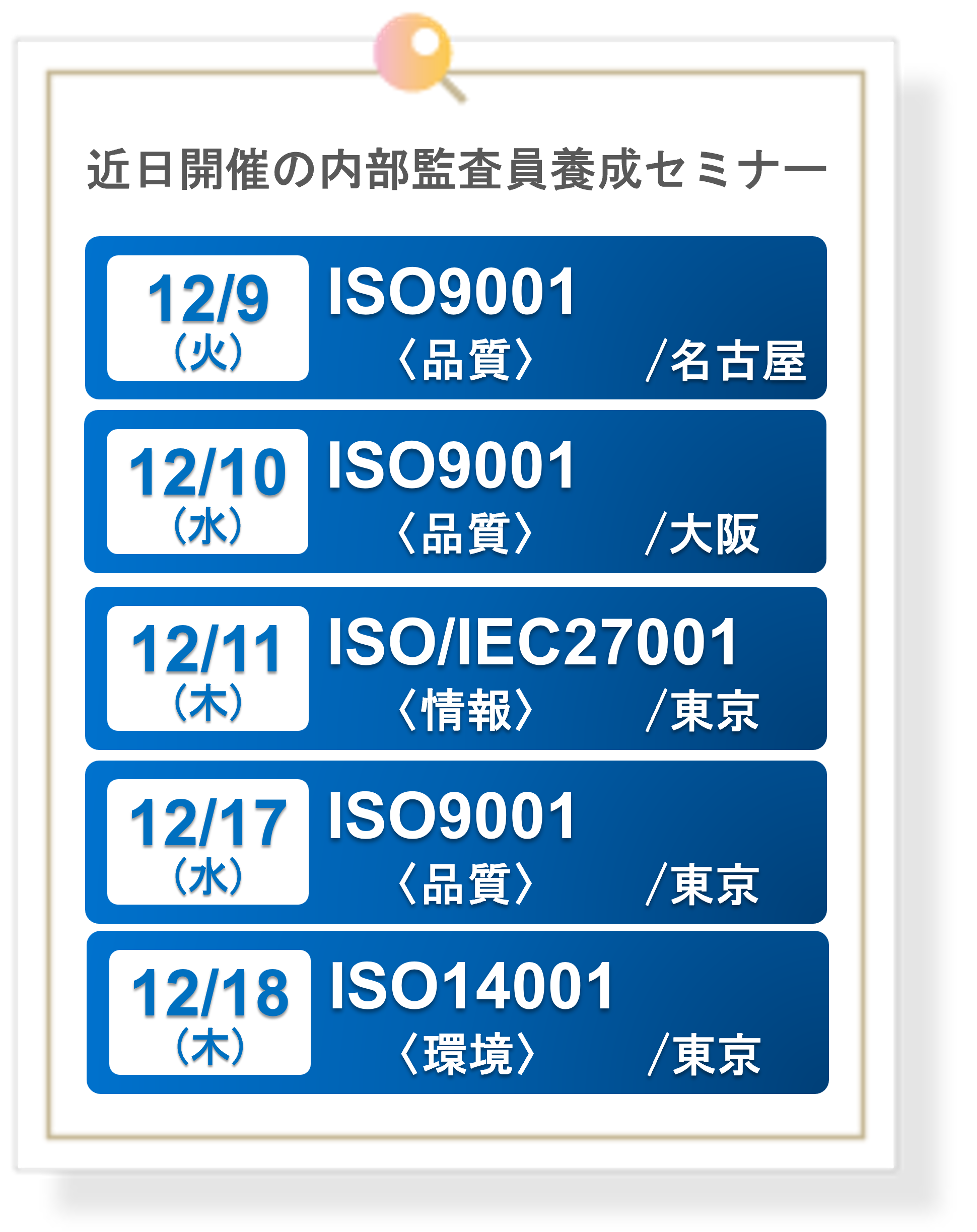 | 2025年12月17日(水) | ISO9001〈品質〉 | ASR本社セミナールーム | 申込み |
