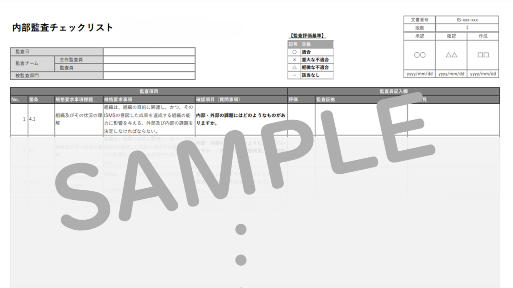 内部監査でそのまま使えるチェックリストを無料配布中!要求事項だけでなく、質問形式に内容を落とし込み、記入例や説明もあるので、初めて内部監査を実施する方にもおすすめです。