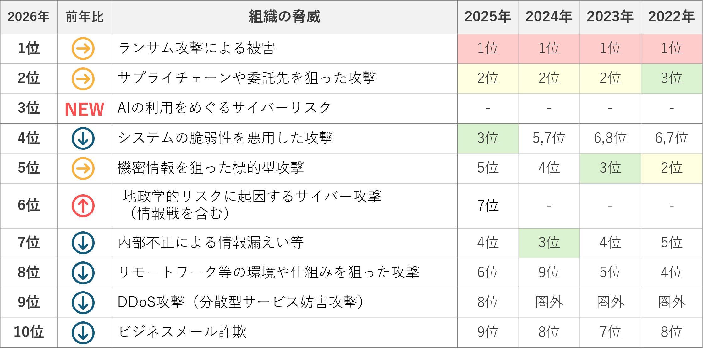 1位「ランサム攻撃」・2位「サプライチェーン攻撃」は4年連続で同じ順位を維持しており、依然として最大の脅威です。一方で、今年は「AIの利用をめぐるサイバーリスク」が初選出でいきなり3位にランクインするなど、AIを取り巻く脅威の台頭が鮮明になりました。